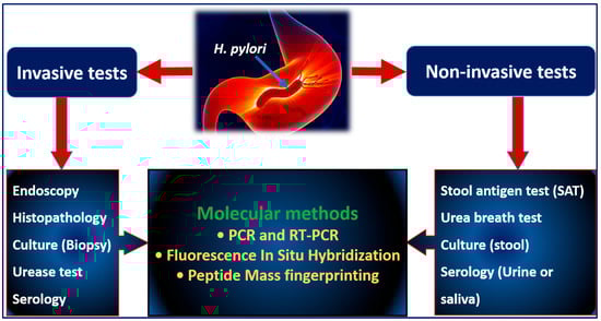 A variety of diagnostic approaches are available, each of which has its own advantages and disadvantages []. There are several types of tests, the selection of which is based on the availability of the tests, the tools available, and the medical needs of the hospital. Diagnostic testing can be performed with both invasive and noninvasive techniques. Examples of noninvasive techniques are serological, stool antigen, and breath tests, whereas invasive techniques include endoscopy, histopathological analyses, quick urea tests, cultures, and PCR tests (Figure 2). In addition to invasive and noninvasive procedures, molecular tools such as PCR, real-time PCR, fluorescence in situ hybridization, and peptide mass fingerprinting are commonly used.