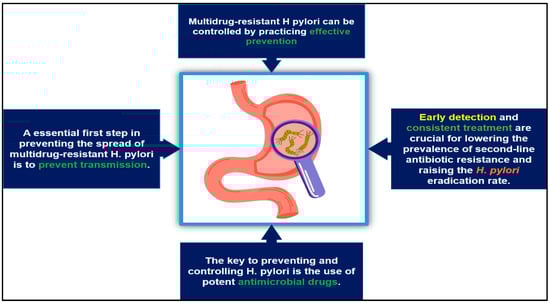 Public health and the environment are at risk because of the high prevalence of infection with H. pylori and the extent of its pharmaceutical treatment []. Efforts should be made to find alternative methods of treating and preventing H. pylori infection. Strategies for preventing and treating multidrug-resistant H. pylori infection are provided in Figure 3, which can serve as a guide for the eradication of multidrug-resistant H. pylori. To combat multidrug-resistant H. pylori, current tactics include making an accurate diagnosis and providing consistent treatments, using antimicrobial drugs judiciously, and preventing H. pylori spread [,]. The control of multidrug-resistant H. pylori infections can be achieved through preventive measures. By implementing appropriate prophylaxis, infection can be reduced effectively. Identifying and treating drug-resistant infections efficiently and consistently are crucial for limiting recurrence and increasing H. pylori clearance rates. Whether invasive or noninvasive, diagnostics are the key to quick and accurate identification [].