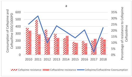 - Baditoiu, L.; Axente, C.; Lungeanu, D.; Muntean, D.; Horhat, F.; Moldovan, R.; Hogea, E.; Bedreag, O.; Sandesc, D.; Licker, M. Intensive Care Antibiotic Consumption and Resistance Patterns: A Cross-Correlation Analysis. Ann. Clin. Microbiol. Antimicrob. 2017, 16, 71. [Google Scholar] [CrossRef] [PubMed]