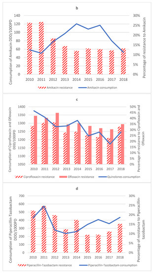- Huang, H.-W.; Liu, H.-Y.; Chuang, H.-C.; Chen, B.-L.; Wang, E.-Y.; Tsao, L.-H.; Ai, M.-Y.; Lee, Y.-J. Correlation between Antibiotic Consumption and Resistance of Pseudomonas Aeruginosa in a Teaching Hospital Implementing an Antimicrobial Stewardship Program: A Longitudinal Observational Study. J. Microbiol. Immunol. Infect. 2022. [Google Scholar] [CrossRef]