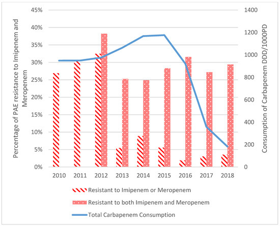 - Paiboonvong, T.; Tedtaisong, P.; Montakantikul, P.; Gorsanan, S.; Tantisiriwat, W. Correlation between Carbapenem Consumption and Carbapenems Susceptibility Profiles of Acinetobacter Baumannii and Pseudomonas Aeruginosa in an Academic Medical Center in Thailand. Antibiotics 2022, 11, 143. [Google Scholar] [CrossRef]