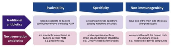 The consensus of the AMR experts is that the golden era of antibiotic discovery has passed, as the continuous and systematic study of microbe-derived small-molecule compounds led to no further discovery despite the advances in genomics, bioinformatics, combinatorial chemistry, and high-throughput screening []. Since the discovery of penicillin in 1928, the scientific communities possess a much broader and deeper knowledge of microbes in terms of their genome, evolution, ecosystem, and host–parasite interactions. Given the progress in microbial knowledge and technology, the solution to AMR should not be limited to microbe-derived small molecules. The advantages of small-molecule compounds are considerable, as they are easy to manufacture, store, deliver, and administer []. However, these compounds have inherent disadvantages of being non-evolvable, non-specific, and immunogenic; thus, it is essential to develop other types of antibiotics that may not be as convenient but have innovative properties that compensate for the challenges. In this review, we present three innovations that next-generation antibiotics should be differentiated from traditional antibiotics such as evolvability, specificity, and non-immunogenicity (Figure 2). Evolvability enables next-generation antibiotics to be updated as bacteria adapt to counteract or evade these antibacterial agents. Specificity allows these antibacterial agents to have minimal off-target effects on human microbiota. Non-immunogenicity reduces the negative impact on human cells and tissues during antimicrobial treatment. Followingly, we discuss each property in terms of traditional small-molecule antibiotics and non-traditional antimicrobial agents, and present several examples of innovation that could overcome the fundamental issues of traditional antibiotics in combating the current AMR crisis.