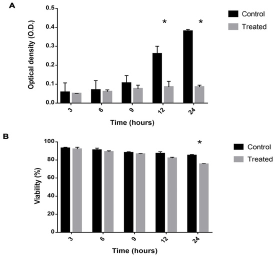The effect of cell exposure to mebendazole on viability and growth was analyzed. Viability was verified by counting using Trypan blue and a Neubauer chamber, while growth analysis was verified by reading the optical density at a wavelength of 600 nm. The two analyses were performed at the exposure times of 3, 6, 9, 12, and 24 h. These experiments were performed in triplicate. The existence of a significant difference between the control group and the treated group—the latter exposed to mebendazole—was verified by the Student’s t test, considered significant for p ≤ 0.05.