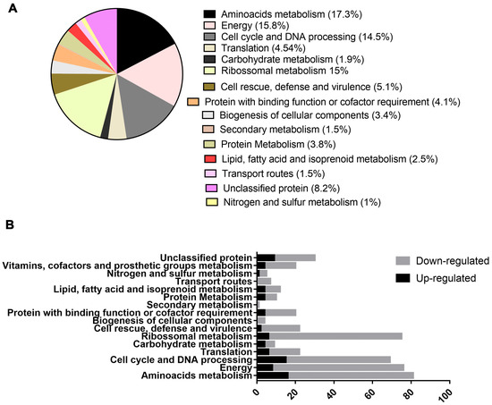 Proteomic analysis identified 462 proteins, of which 136 were upregulated (Supplementary Table S1) and 326 were downregulated (Supplementary Table S2). All the proteins categorized as differentially expressed had a fold change at least equal to 1.5. Functional enrichment made it possible to identify the functions of these proteins, although 38 of them could not be reannotated. The main metabolic classes of the differentially expressed proteins identified were amino acid metabolism, energy metabolism, ribosomal metabolism, and proteins related to the cell cycle and DNA processing (Figure 2A,B).