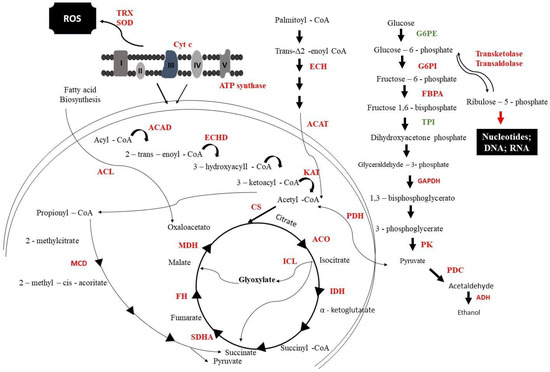 Metabolic model of P. brasiliensis response to mebendazole exposure. From the image, it is possible to verify enzymes that are downregulated (red) and upregulated (green). G6PE: glucose-6-phosphate; G6PI: glucose-6-phosphate isomerase; FBPA: fructose1,6-biphosphate aldolase; TPI: triosephosphate isomerase; GAPDH: glyceraldehyde 3-phosphate dehydrogenase; PK: pyruvate kinase; PDC: pyruvate decarboxylase; PC: pyruvate carboxylase; ADH: alcohol dehydrogenase; ACAD: acyl-CoA dehydrogenase; ECHD: enoyl-CoA hydratase; ACAT: cholesterol acyltransferase; KAT: ketoacyl-CoA thiolase; PDH: pyruvate dehydrogenase; CS: citrate synthase; ACO: aconitase; ICL: isocitrate lyase; IDH: isocitrate dehydrogenase; KGD: ketoglutarate dehydrogenase; SDHA: succinate dehydrogenase; FH: fumarate hydratase; MDH: malate dehydrogenase; MCD: methylcitrate dehydratase; SOD: superoxide dismutase; TRX: tyrodoxine; Cyt C: cytochrome c oxidase. I-V proteins related to electron transport chain.