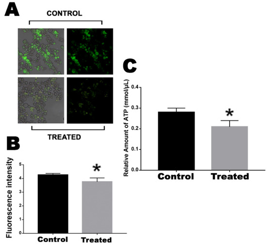 The colorimetric detection kit (Sigma-Aldrich) was used to quantify the ATP concentration. The reaction was performed according to the manufacturer’s instructions. The process is established by the phosphorylation of glycerol, which results in a color change detected by absorbance. For the analyses, we used 1 mL of the samples, both treated with the compound and the control. Samples were centrifuged at 3500× g, and the supernatant was discarded; then, the assay buffer from the kit was added to lyse and deproteinate the cells. The reading was performed at 570 nm. The analyses were performed in triplicate, and the statistical difference was evaluated by the Student’s t test, considered significant when p ≤ 0.05.