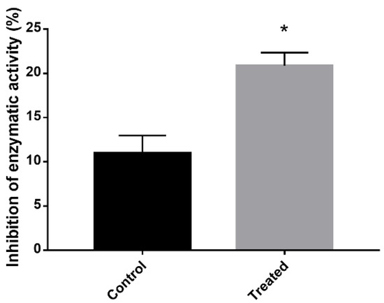 The results demonstrated an inhibition of the electron transport chain and an increase in oxidative stress in cells treated with mebendazole for 12 h. To confirm this hypothesis, the percentage of SOD inhibition in cells treated or not treated with the drug were verified. The SOD inhibition rate was actually higher in the exposed cells compared to the control cells (Figure 6).