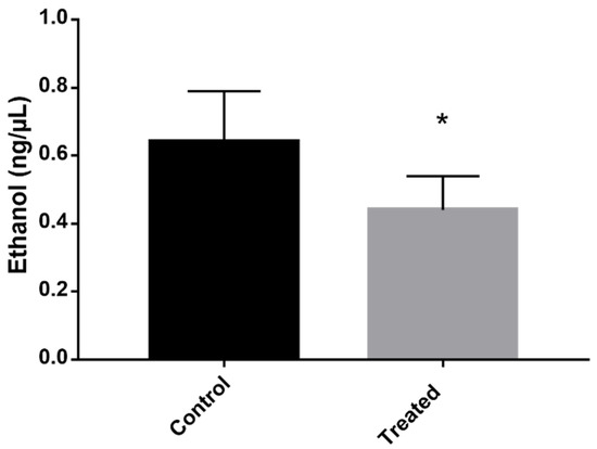 Evaluation of the concentration of ethanol produced by cells exposed to mebendazole. The production of ethanol in the cells was verified by quantifying it in the medium containing cells exposed (treated) or not exposed (control) to mebendazole for 12 h. The * indicates a significant difference between the control and treated samples, with a p value ≤ 0.05. The error bar represents the deviation between the biological triplicates.