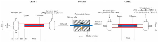 Schematic of the CEMS-BioSpec system used for the real-time monitoring of biofilm parameters under continuous flow conditions. The CO2-free sweeper gas is introduced under controlled flow into the annular space of CEMS (red shaded region), allowing for the collection of biofilm-evolved CO2 and subsequent analysis by a downstream infrared CO2 analyzer. Biofilm biomass was measured between the two CEMS units (BioSpec) via the internal silicone tube (blue shaded region, containing biofilm biomass) being passed through a cavity with a LED illuminating the tube from one side and a digital light sensor on the transverse side measuring the amount of illumination absorbed by biomass in the tube. All dimensions are to the nearest mm [20].