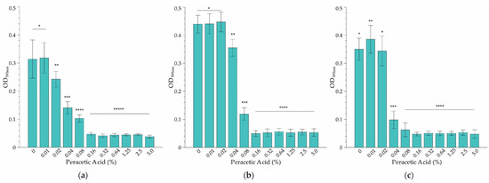 The results based on the microbroth dilution method showed that temperature had a relatively minor effect on the MIC of PAA on L. monocytogenes serovar ½a EGD-e at the three temperatures tested (Figure 2). However, the effect at sub-MIC levels was varied. For instance, while significant inhibition of growth at the coldest temperature (10 °C) was evident at a PAA concentration of 0.02%, the MIC was 3-fold higher (0.16% PAA) (Figure 2a). Incubation at room temperature (22 °C) resulted in a doubling of the lowest concentration where growth was affected, to 0.04% PAA (Figure 2b). However, the MIC was the same as that of the refrigeration temperature. Cultivation at body temperature (37 °C) had a substantial effect on growth inhibition (Figure 2c), with a reduction of the MIC to 0.08% PAA (2× lower than that observed at 4 °C and 22 °C, Figure 2a,b). Overall, it was decided to select 0.16% PAA as the MIC since it was effective at inhibiting growth across the temperature range applied in this study.