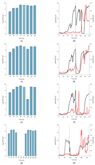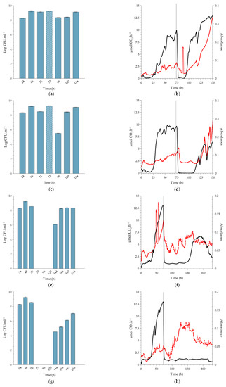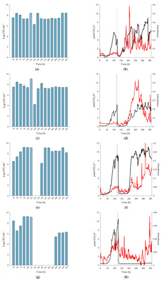 The pre-exposure trends in planktonic cell production by the biofilms cultivated at higher temperatures showed a similar trend to that of 10 °C, with an average yield between 108 and 109 CFU.mL−1 (Figure 4a,c,e,g and Figure 5a,c,e,g).