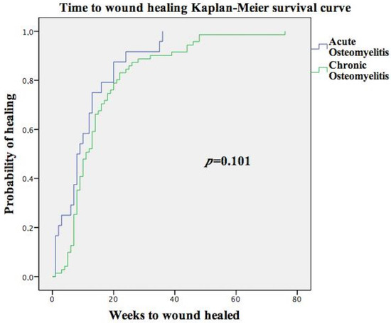 Significant differences were not observed in the mean healing time in DFU with acute osteomyelitis (12.76 weeks (4.50;18)) compared to chronic osteomyelitis (15.31 weeks (7;18.25); p = 0.101). Figure 1 shows the Kaplan-Meir survival curve of the time to wound healing among patients with acute osteomyelitis versus chronic osteomyelitis. There were 141 (65.6%) patients who had soft tissue infection, but compared with patients without soft tissue infection, significant differences were not observed in mean healing time (15.95 (6;20) vs. 16.59 (7.25;19.75) weeks; p = 0.618).