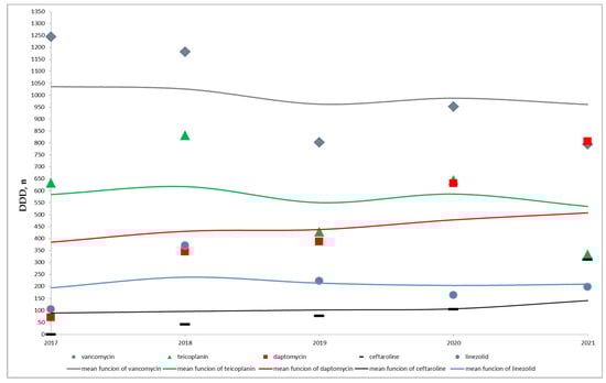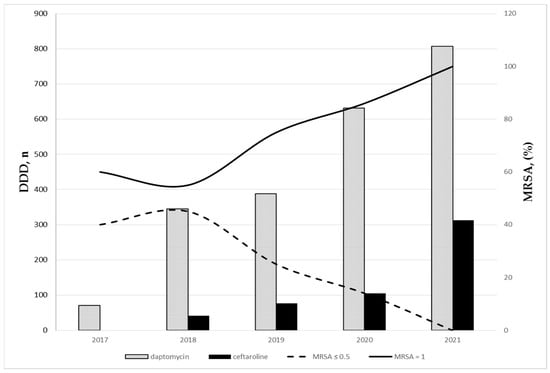 On the contrary, a statistically significant increase in the use of daptomycin and ceftaroline across years (for both antibiotics, Kendall’s rank correlation coefficient equal to 1.0 and p = 0.027) was observed, Table 1 and Figure 1. In particular, the median total of daptomycin DDDs was 387, IQR (344–387), changing from 70 DDDs in 2017 to 807 DDDs in 2021 and the median total of ceftaroline DDDs was 77, IQR (41–105), from 0 in 2017 to 312 DDDs in 2021, Table 1.