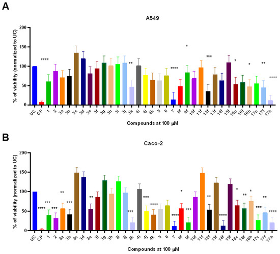 The in vitro anticancer activity of compounds 1–17 on A549 (A) and Caco-2 (B) adenocarcinoma cell line. Cells were exposed with fixed 100 µM of compounds 1–17 or cisplatin (CP) that served as a cytotoxicity control for 24 h. After the treatment, the remaining viability was determined by using MTT assay. Data represent the mean ± SD of triplicate experiments (n = 3). Statistical differences were determined using the Kruskal–Wallis test. * p < 0.05; ** p < 0.01, *** p < 0.001, **** p < 0.0001.