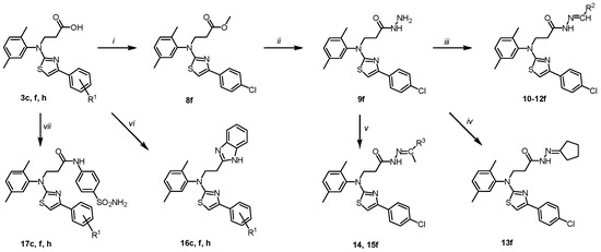 The carboxyl functional group can be an important constituent of a pharmacophore [68]. Its functionalisation can greatly expand the library of biological properties of compounds [69,70]. To expand the library of thiazole derivatives and to evaluate the influence of substituents on their biological properties, some transformations of the carboxyl group were performed (Scheme 2). Firstly, acid 3f was esterified with methanol to obtain ester 8f. No additional catalyst was required for this reaction with hydrobromide analogue. Afterwards, ester 8f was refluxed in 1,4-dioxane with hydrazine monohydrate and the resulting acid hydrazide 9f was then condensed with aldehydes and ketones. The structure of 9f was confirmed by the NMR techniques and microanalysis data. The presence of the CONHNH2 group protons were indicated by the singlets at 9.11 (NH) and 4.07 (NH2) ppm in the 1H NMR spectrum of 9f, whereas the spectral line of the carbon of the C=O group resonated at the characteristic area of the 13C NMR spectrum, i.e., at 169.4 ppm (Supplementary Material, Figures S39 and S42).