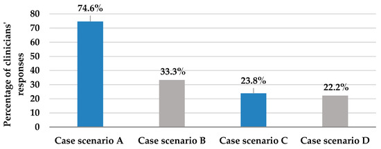 This figure describes clinicians’ responses to question 1; selection of the appropriate case scenario where immediate empiric antifungal should be started, from 4 provided patient case scenarios. Case scenario A: Patient is still febrile and did not respond to broad-spectrum antibiotics (appropriate). Case scenario B: Patient shows a positive B-D-glucan test (inappropriate). Case scenario C: Patient exhibits signs of septic shock and is on maintenance hemodialysis (appropriate). Case scenario D: Patient is vitally stable, but urine culture reveals Candida species growth (inappropriate).