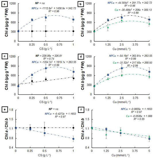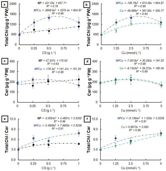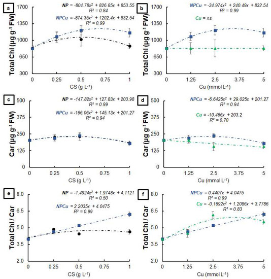 Total chlorophyll (a,b), carotenoids (c,d), and total chlorophyll/carotenoids ratio (e,f) of leaf discs of Coffea arabica cv. IPR 100 at 40 days after treatment with distilled water, as a control (CONT), chitosan nanoparticles without Cu2+ ions (NP), chitosan nanoparticles containing Cu2+ ions (NPCu), and free Cu2+ ions (Cu). The formulations were diluted in distilled water, obtaining the corresponding concentrations of chitosan (CS) in NP and NPCu treatments (0.25; 0.5; 1 g L−1) and of Cu2+ ions (1.25; 2.5; 5 mmol L−1) in NPCu and Cu treatments. Results are expressed as mean (n = 4) ± standard error. The model and coefficient of determination (R2) are also shown (p < 0.05). ns = not significant.
