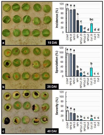 By evaluating the visual aspect of the leaf discs, it was possible to verify a high incidence of the disease in the CONT and NP treatments (0.25 and 0.5 g L−1) at 15 days after infection (DAI) (Figure S1). In the other treatments, the incidence of disease on the leaf discs at 15 DAI was considerably lower (Figure S2). In general, sporulation started at 20 DAI, intensifying at 25 DAI in the CONT and NP, as well as in NPCu and Cu treatments at the lowest Cu concentration (1.25 mmol L−1). On the other hand, the protective effect conferred by NPCu and NP treatments (2.5 and 5 mmol L−1) was visible over the 40 DAI (Figures S1 and S2).