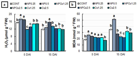 The slight increase in the MDA content at 5 DAI indicates the initial induction of oxidative stress by most treatments (Figure 6). However, H2O2 levels were normal or even reduced compared to CONT in the NPCu and Cu treatments, suggesting that protective mechanisms were induced from 5 DAI or earlier. They might have contributed to decreasing the MDA content in these treatments at 15 DAI.