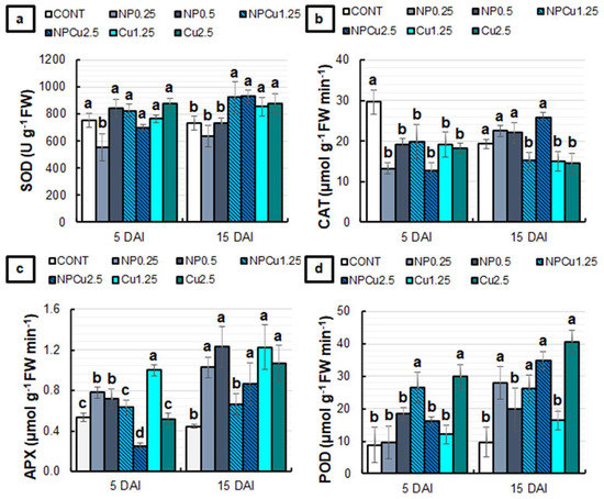 The NP (0.25 and 0.5 g L−1) and Cu (1.25 mmol L−1) treatments induced an increase in ascorbate peroxidase (APX) activity compared to the CONT at 5 DAI. In contrast, NPCu treatment (2.5 mmol L−1) promoted a 54% reduction in enzyme activity. At 15 DAI, only the NPCu treatment (1.25 mmol L−1) failed to show significant differences compared to CONT, with an increase in the APX activity observed in the other treatments (Figure 7c). For peroxidase (POD) activity, at 5 DAI, it was possible to observe an average increase of 211% in NPCu (1.25 mmol L−1) and Cu (2.5 mmol L−1) treatments compared to the CONT. At 15 DAI, a rise of 60% in POD activity was induced by the Cu treatment (1.25 mmol L−1), 160% by NPCu (1.25 mmol L−1), 180% by NP (0.25 g L−1), 250% by NPCu (2.5 mmol L−1), and 310% by Cu (2.5 mmol L−1), compared to the CONT (Figure 7d).