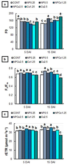 For the relative electron transport rate of photosystem II (rETR), only NPCu treatments (1.25 and 2.5 mmol L−1) were significantly increased at 5 DAI compared to the CONT. At 15 DAI, the lowest concentrations of NP and NPCu induced higher rETR values than the CONT. On the other hand, an 18% reduction in rETR was observed in the Cu treatment (2.5 mmol L−1) compared to the CONT (Figure 8c).