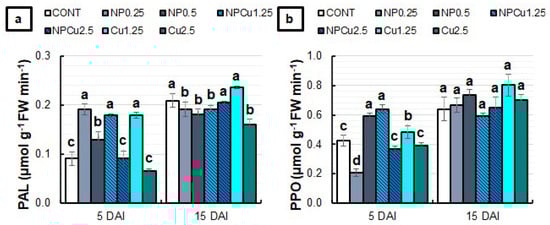 At 5 DAI, all formulations at the lowest concentrations (0.25 g L−1 or 1.25 mmol L−1) and the NP treatment (0.5 g L−1) increased the phenylalanine ammonia-lyase (PAL) activity by nearly 100% compared to the CONT. At 15 DAI, NPCu (2.5 mmol L−1) and Cu (1.25 mmol L−1) treatments maintained PAL activity equal to CONT, while the other formulations reduced the enzyme activity (Figure 9a). Regarding the polyphenol oxidase (PPO) activity at 5 DAI, an average increase of 40% was observed in the NP (0.5 g L−1) and NPCu (1.25 mmol L−1) treatments compared to the CONT. Furthermore, a 14% increment was induced by the Cu treatment (1.25 mmol L−1). At 15 DAI, there were no significant differences among treatments in PPO activity (Figure 9b).