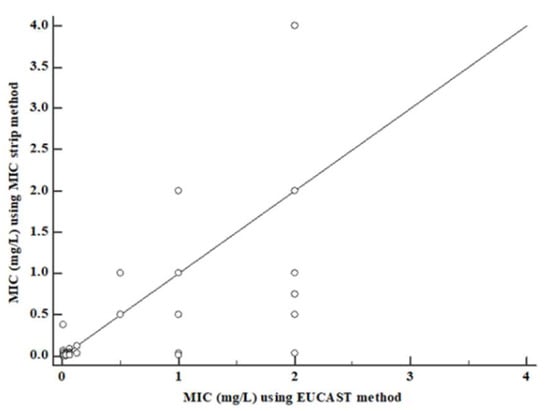 Overall, all the percentages appear to be significant, and this correspondence suggests the possibility to test isavuconazole in vitro susceptibility with the MIC Strip test, due to a high agreement with the EUCAST reference method. However, further studies should be performed to encourage this suggestion, especially regarding rare yeasts. For example, S. cerevisiae MIC results from broth microdilution are concordant with what is reported in the literature, but we don’t have literary data enough regarding MIC Strip test with which to compare those obtained by us for this species [28,29]. Consequently, we need a major number of isolates to establish the effectiveness of the commercial method, considering its distance from the reference method during our analyses. Furthermore, S. capitata is a yeast with very singular growth times and characteristics, and we could attribute to these peculiarities some possible discrepancies between the commercial method and the reference method. However, MIC values reported from our EUCAST broth microdilution were concordant with the literature data [30].