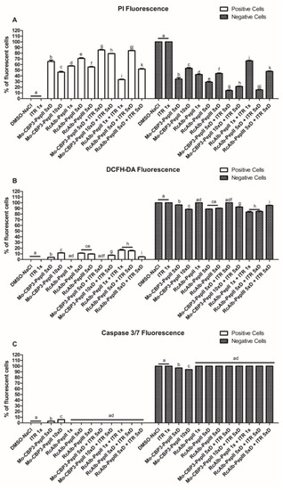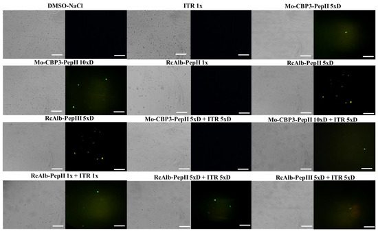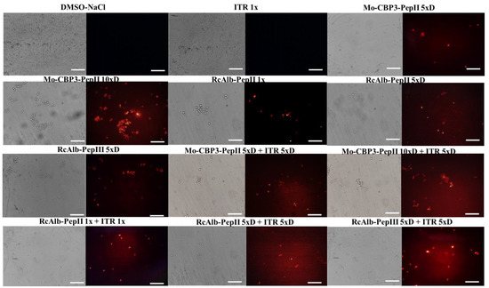 By analyzing images using ImageJ software, it was possible to evaluate the number of PI-fluorescent cells in each treatment (Figure 3A). The combinations made by Mo-CBP3-PepII 5×D + ITR 5×D, Mo-CBP3-PepII 10×D + ITR 5×D, and RcAlb-PepII 5×D + ITR 5×D presented a higher number of positive PI-fluorescent cells than their respective controls (Figure 3A). Mo-CBP3-PepII 5×D + ITR 5×D, Mo-CBP3-PepII 10×D + ITR 5×D, and RcAlb-PepII 5×D + ITR 5×D presented a total of 85, 74, and 84%, respectively, positive fluorescent cells. In contrast, ITR, Mo-CBP3-PepII 5×D, Mo-CBP3-PepII 10×D, RcAlb-PepII 5×D alone presented a total of, respectively, 0, 45, 64, 70% PI-fluorescent cells (Figure 3A).
