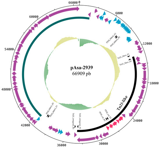 Gene map of the pAsa-2939 plasmid. This map was produced with the DNA plotter software. The red genes code for antibiotic resistance proteins, the blue genes for hypothetical proteins, and the purple genes for proteins with other known functions. The black arc indicates the transposon (Tn21-like). The green arc corresponds to conjugation genes and the inner circle corresponds to the GC skew. The primers used for PCR genotyping are also shown on the map with arrowheads.