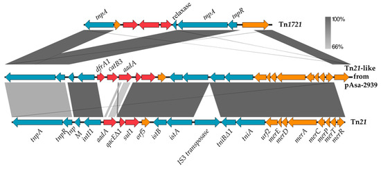 A BLAST analysis revealed that a section of about 19.4 kb was very similar to the Tn21 transposon sequences. A typical transposon from the Tn21 family includes a gene for its own transposition, an integron, and a mercury resistance (mer) operon. The Tn21 family is involved in dissemination of ARGs due to the presence of an integron [18]. This mobile element is responsible for the acquisition of various resistance genes. Figure 2 presents a comparison of pAsa-2939 transposon with Tn21 from E. coli (accession AF071413). First, for the homologous regions, the sequences are highly similar with 99.97% nucleotide identity. The tnpA gene, which encodes a transposase, and the aminoglycoside antibiotic resistance gene aadA are less similar with a 78% and 57% nucleotide identity, respectively. The TnpA protein from pAsa-2939 seems to originate from the Tn1721 with 99.19% nucleotide identity (accession X61367). Furthermore, there is a new region in the pAsa-2939 transposon which includes a chloramphenicol resistance gene and a dihydrofolate reductase. However, this transposon lacks the IS3 family transposase in comparison with the reference sequence as shown in the Figure 2. The nearest transposon sequence to the one found in pAsa-2939 is in the pCFS3273-1 plasmid (268,665 bp, accession CP026933) from E. coli Strain CFS3273 (cover 89%, identity 99.87%).