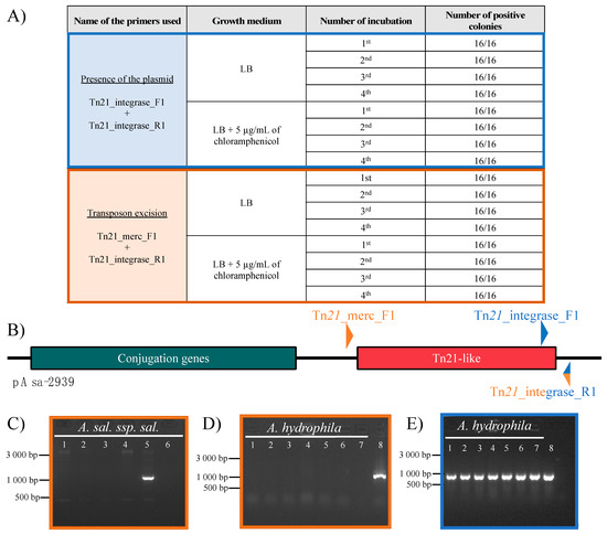 To evaluate the plasmid stability in SHY15-2939, we first incubated the bacteria at 18 °C on two LB media, one without antibiotic and the other containing 5 µg/mL of chloramphenicol. Then we produced PCR lysates for 16 colonies from each medium and streaked those colonies on new LB agar without antibiotics. We streaked the colonies three times (for a total cultivation period of 288 h) and produced a total of 64 lysates. As shown in the Figure 3A,B, the PCR primers targeting junction between the Tn21-like transposon and the plasmid show a signal for every colony. Thus, the variability of the MIC is not due to the loss of the plasmid. Since the plasmid seems to be stable, the variability of the MIC might be due to the instability of the transposon. To verify this, we used a pair of primers that are located outside the sequence of the transposon. When the strain carries pAsa-2939 without the transposon, an amplification is produced by the excision of the transposon and the junction of the two plasmid ends together. We confirmed this result by testing this primer pair on other A. salmonicida subsp. salmonicida strains not carrying pAsa-2939 (Figure 3C). None of them gave an amplicon confirming the excision of the transposon of pAsa-2939 in SHY15-2939. It appeared that an amplicon can be produced with this pair of primers for Strain SHY15-2939 regardless the growth conditions or the time of cultivation (Figure 3A,B). On the other hand, no amplicon where detected with the same primers with the A. hydrophila trans-conjugants that bears pAsa-2939 suggesting no transposon excision in this case (Figure 3D,E). The amplicon obtained with SHY15-2939 was sequenced, which revealed that it corresponds to the expected sequence for the junction of the plasmid after excision of the transposon. These results confirm the capacity of the transposon to be excised from the plasmid in Strain SHY15-2939 and the stability of the transposon in A. hydrophila trans-conjugant. These results validate the difference in chloramphenicol sensitivity observed for SHY15-2939 and the A. hydrophila trans-conjugant.
