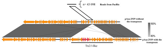 To confirm the presence of the plasmid without the transposon, the genomic DNA of Strain SHY15-2939 was sequenced with long-read sequencing (PacBio SMRT technology). After performing the assembly, it was possible to again obtain the complete assembled sequence of the pAsa-2939 plasmid. To confirm the potential absence of the transposon in a proportion of cells, the reads from the PacBio sequencing were mapped on a theoretical version of pAsa-2939 without the transposon. In total, 43 098 reads were aligned to the junction using minimap2 [31] (Figure 4), which again confirms the excision of the transposon. It was not possible to find a secondary shorter assembly of the plasmid that would be the truncated version of the plasmid without the transposon. This is not surprising considering how the assembly algorithm works and that there were a low number of reads that were mapped on the junction of pAsa-2939 without the transposon.