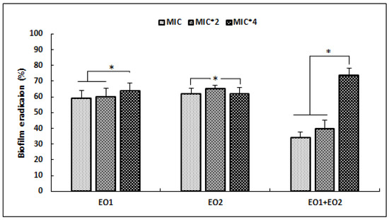 Effects of R. officinalis (EO1) and M. communis (EO2) essential oils and their combination (EO1 + EO2) on the reduction of preformed biofilm of S. aureus ATCC 25923, expressed as eradication percentages (%) and evaluated by the Crystal Violet staining assay. Values are the average of at least three independent determinations. Error bars represent standard deviations. (*) Differences were considered significant at p < 0.05.