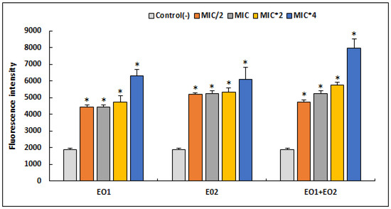 We have found that tested EOs as well as their association caused an increase in the production of reactive oxygen species compared to the control (p < 0.05). It was deduced that equal proportion of R. officinalis (50%) and M. communis (50%) strongly induced oxidative stress in an S. aureus strain treated with a MIC × 4, triggering a high production of ROS in a dose-dependent manner. At the same concentration (MIC × 4), both EO1 and EO2 showed high production of ROS (p > 0.05) when compared to their combination (EO1 + EO2).