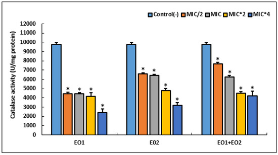 Effect of different concentrations of R. officinalis (EO1) and M. communis (EO2) essential oils and their combination (EO1 + EO2) on the activity of oxidative stress enzyme (catalase) in S. aureus ATCC 25923. Bacteria were incubated with various concentrations of EOs for 24 h. An asterisk represents a significant difference (p < 0.05) between each treatment and the negative control.