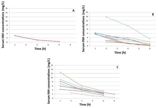Isoniazid serum concentrations (in mg/L) according to NAT2 genotyping by acetylator type. (A) NAT2 homozygous fast genotype; (B) NAT2 heterozygous intermediate genotype; and (C) NAT2 homozygous slow genotype.