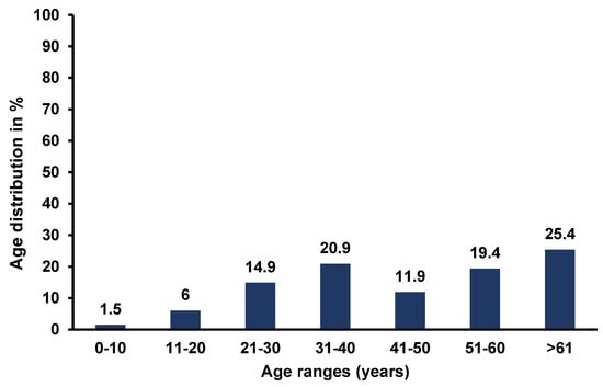 The majority of the patients’ files reviewed were males (47; 70.1%), with most patients presenting with co-morbidities. Co-morbidities included hypertension, chronic osteomyelitis, and HIV, with prevalence rates of 22.4%, 13.4%, and 11.9%, respectively. The predisposing factors for SSTIs were age > 61 (Figure 1), alcohol, smoking, diabetes mellitus, and being male, at 25.4%, 68.7%, 64.2%, 9%, and 70.1%, respectively (Table 1).