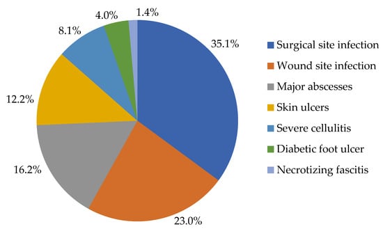 More patients presented with complicated SSTIs (98.5%) than uncomplicated SSTIs (1.5%). The common complicated SSTIs seen were surgical site infections (SSIs), which accounted for 35.1% of SSTIs, wound infections (23.0%), and major abscesses (16.2%) (Figure 2).