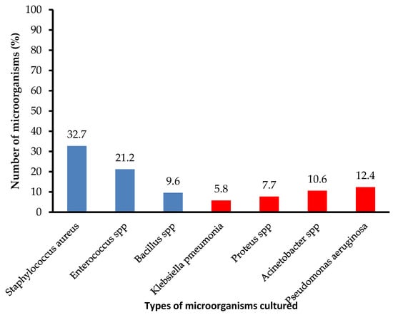 Cultured microorganisms. NB: Blue shaded bars represent Gram-positive microorganisms and the red shaded bars represent Gram-negative microorganisms.