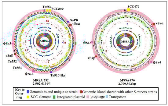 Circular diagram of the MRSA 252 and MSSA 476 chromosomes. Colored segments on the outer ring (pink): genomic islands and horizontally acquired DNA. Rings inside and moving internally represent annotated CDS (in Mbp). tRNA and rRNA (green), additional DNA compared to other S. aureus strains (red and blue), percentage of G + C content, and G + C deviation (>0%, olive; <0%, purple). Predicted function coding for CDSs: pathogenicity/adaptation (royal blue); energy metabolism (black); information transfer (red); surface-associated (dark green); degradation of large molecules (cyan); degradation of small molecules (magenta); central/intermediary metabolism/intermediary metabolism (multi-colored); unknown (light green); regulators (light blue); conserved hypothetical (multi-colored segments); pseudogenes (brown); phage plus insertion sequence elements (pink); miscellaneous (grey). Adapted from Holden et al. [].