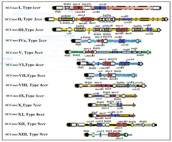 As an important basic mobile genetic element, the SCC serves as the motor vehicle for gene substitution among Staphylococcus species. It typically contains the mec gene (although not always present), which codes for methicillin resistance, regulatory genes, as well as the cassette chromosome recombinases (ccr), which enables the integration and cutting of SCCmec []. SCCmec typing enables structural determination of SCCmec and can assist in inferring the origins of particular MRSA strains []. Each SCCmec element integrates at the same site, which is a precise site at the 3‘ end of a unique ORF (open reading frame) of unknown function, designated orfX []. To date, 13 different types of SCCmec (I-XIII) have been defined according to their subparts, namely, the ccr and the mec complexes [,] (Figure 2).