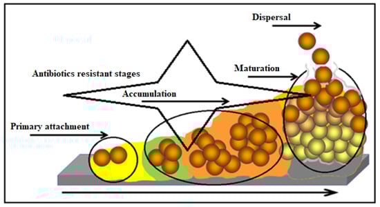 Microbial populations tend to adhere to surfaces by producing extracellular polymeric substances (EPS) and forming biofilms (Figure 3) []. Bacterial cells growing in a biofilm are difficult to treat by antibiotics since the EPS matrix prevents them from reaching the bacteria via physical repulsion or limited diffusion []. It has been estimated that of all bacterial infections, ~80% involve biofilm formation [], and these appear to be 10–1000-fold more resistant to antibiotics compared to their planktonic counterparts []. The challenge to eradicate bacterial biofilms via antibiotics is well documented, with evidence suggesting some variabilities between drugs. For example, oxacillin, cefotaxime, and vancomycin have shown limited penetration, whereas amikacin and ciprofloxacin are far more effective in this function []. However, eradication of biofilms is very challenging, especially in clinical settings, as high rates of recurrent or chronic bacterial infections have been observed due to biofilms []. The development of biofilm-related S. aureus infections is always associated with medical devices or procedures used as part of patients’ management, such as indwelling catheters or implants, and chronic conditions such as chronic lung infections, chronic wounds, endocarditis, and others []. Several in vitro studies have demonstrated the promising role of bacteriophages in controlling S. aureus biofilms [,,]. In addition, data on the complete resolution of S. aureus biofilm-related infections have been published recently by Pires et al. []. However, over time, bacterial biofilms have become increasingly resistant to yet more antibiotics, and innate host defense mechanisms, including antimicrobial peptides (AMPs) and neutrophil phagocytosis, have proven ineffective []. Moreover, the use of sub-minimal inhibitory concentration (MIC) of daptomycin and tigecycline could activate a signal for the induction of virulence genes in S. aureus via the regulation of biofilm adhesion factor genes and its exoproteins [].