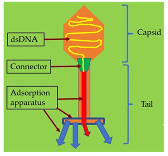 The term “phage” is defined as a type of virus that can enter and destroy bacterial cells whose potential was appreciated early in history [,]. The morphological structure of a bacteriophage is unique as it consists of a head that is filled with DNA or RNA and a tail that is used for the introduction of the genome into the bacterial cells (Figure 4). It has limited receptors on eukaryotic cells; hence, it may not enter mammalian cells, making it the most promising alternative therapeutic option in humans [,].