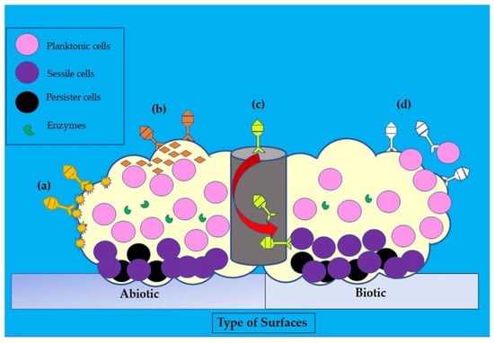 Illustration of the disruptive mechanisms of bacteriophages in Staphylococcus aureus biofilms on abiotic and biotic surfaces by the (a) expression of polysaccharide depolymerases which degrade extracellular matrix, (b) induction of host cells to produce exopolysaccharides (EPS)-degrading enzymes, (c) diffusion via biofilm water channels for inner layer penetration, and (d) adsorption to bacteria for biofilm penetration. The role of each bacteriophage is depicted in various colors (dark yellow, orange, yellow, and white).