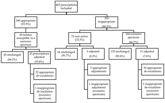 The empirical prescription was inappropriate in 216 patients (46.5%): in 144 patients (66.7%) due to “excessive spectrum” and in 72 (33.3%) as “non-active” (Figure 1). Of the inappropriate prescriptions, only 17 (7.87%) were adjusted; most adjustments/de-escalations were appropriate (88.2%).