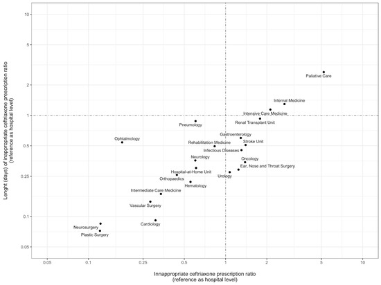 Evaluation of inappropriate empirical prescription of ceftriaxone, per department. Comparison between departments was performed using a ratio between the observed number of days of inappropriate ceftriaxone prescriptions and the expected number of days of inappropriate ceftriaxone prescriptions (with hospital level as reference). Dots represent the different hospital departments evaluated. The vertical and horizontal dot–dash lines represent the general hospital ratio (where the values observed correspond to the values expected for the number of inappropriate prescriptions and duration of inappropriate prescriptions). The axis values are represented in a logarithmic scale.