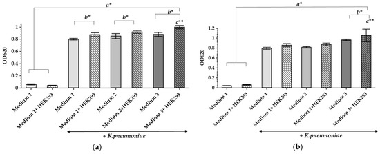 The influence of culture medium and HEK293 cells on the growth of K. pneumoniae UHI 1090. Growth shown under static conditions, after 24 h (a) and 48 h (b) of incubation. Data are expressed as mean values (n = 6). Error bars represent standard deviations. Data were analyzed by one-way ANOVA with a Barlette post hoc test. * Represents significant differences at p < 0.05, ** represents significant differences at p < 0.001. a–as compared to the control groups incubated without bacteria; b–as compared between the samples incubated with or without HEK293; c–as compared to all other groups.