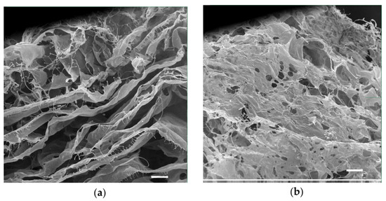Scanning electron micrographs of a 3D collagen scaffold (scale bar corresponds to 100 µm). (a) cross-section; (b) the surface of the scaffold.