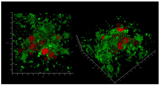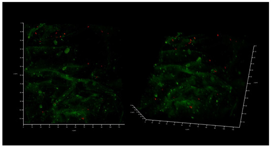 A 48-h old K. pneumoniae UHI 1090 culture developed on a 3D collagen scaffold. The scaffold was not seeded with HEK293 cells, but fetal bovine serum was added as a source of blood proteins (medium No. 1). Confocal laser scanning microscopy imaging, 120 µm × 120 µm × 35 µm, 10 µm per division. AmyGreen was used to stain collagen (green signal), and ethidium bromide was used to stain the bacterial cells (red signal).