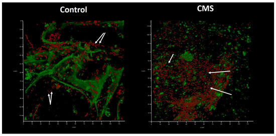 In vitro wound model of a K. pneumoniae UHI 1090 biofilm exposed to colistin methanesulfonate (enlarged details of parts of Figure 6). Images were taken after 48 h of biofilm development on a 3D collagen scaffold seeded with the epithelial-like cell line HEK293 in medium No. 1 (90% DMEM/high glucose, 10% FBS) supplemented with 5 mg/L colistin methanesulfonate (CMS) or without (control). Confocal laser scanning microscopy imaging, 120 µm × 120 µm × 35 µm, 10 µm per division. AmyGreen was used to stain collagen and bacterial amyloid fibers (green signal) and ethidium bromide was used to stain eukaryotic nuclei and bacteria (red signal). Arrows point to amyloid fibers associated with bacterial cells.